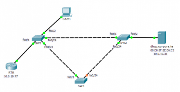 SW2(config)#int fa0/1 SW2(config-if)#switchport mode trunk SW2(config)#int fa0/24 SW2(config-if)#switchport mode trunk SW2(config)#vtp domain corpora.te Changing VTP domain name from NULL to corpora.te SW2(config)#vtp password plop Setting device VLAN database password to plop SW2(config)#vtp mode client Setting device to VTP client mode.