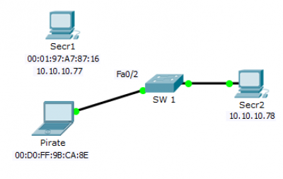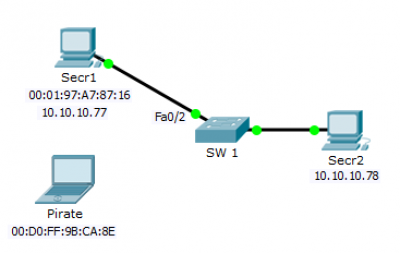 Sans la présence de port security restrictif, cela ne nous protège pas encore d'une attaque du type homme du milieu rencontrée dans le chapitre précédent. En effet, avec la bonne adresse MAC, l'interface connectée sur le port autorisé, on peut refaire les mêmes manipulations et aboutir aux mêmes résultats si la configuration de port security est trop laxiste (maximum d'adresses autorisées trop important).