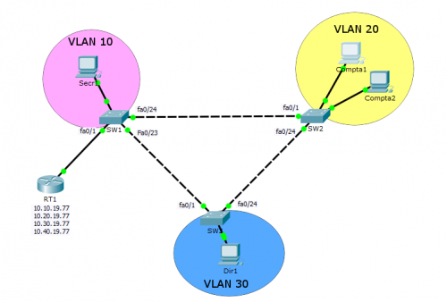 Ayant un nombre limité de ports sur SW1, nous utiliserons l'étiquetage des trames transitant par le port fa0/1 du commutateur (mode trunk) avec leur numéro de VLAN pour pouvoir les différencier sur une connexion commune vers le routeur RT1 (lui même capable d'encapsuler les trames taguées). Les ports des commutateurs reliés aux autres commutateurs seront également tagués en mode trunk.