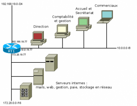* Secrétariat : VLAN 10, adresses de 10.10.0.0 à 10.10.255.255 * Comptabilité : VLAN 20, adresses de 10.20.0.0 à 10.20.255.255 * Direction : VLAN 30, adresses de 10.30.0.0 à 10.30.255.255 * Commerciaux : VLAN 40, adresses de 10.40.0.0 à 10.40.255.255