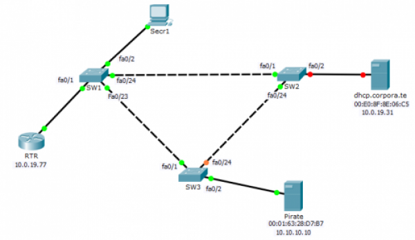 SW2(config)#ip dhcp snooping SW2(config)#ip dhcp snooping vlan 1 SW2(config)#interface fastEthernet 0/2 SW2(config-if)#ip dhcp snooping trust SW2(config)#interface fastEthernet 0/1 SW2(config-if)#no ip dhcp snooping trust SW2(config)#interface range fastEthernet 0/3-24 SW2(config-if-range)#no ip dhcp snooping trust