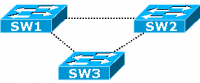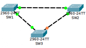 Les ports racines (RP pour root port) des commutateurs SW2 et SW3 sont au plus près du commutateur racine et les ports désignés entre chaque commutateur (DP pour designed port) sont placés de telle sorte que le port de SW3 relié au port de SW2 n'est ni RP ni DP : il est donc bloqué et la liaison directe est interrompue entre les commutateurs SW2 et SW3.